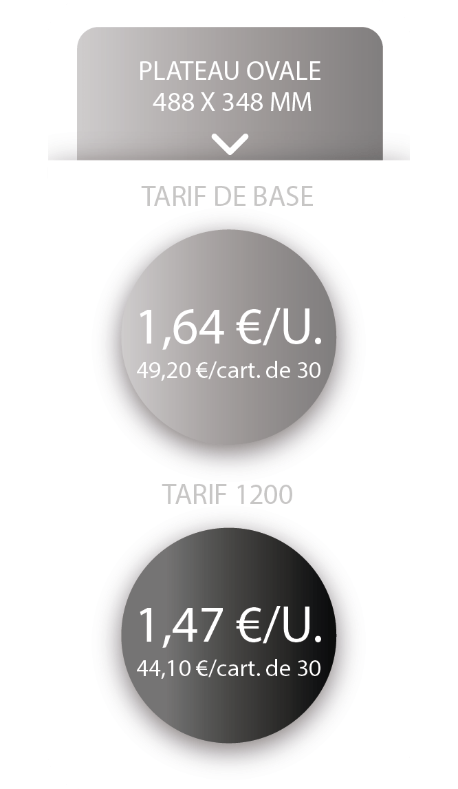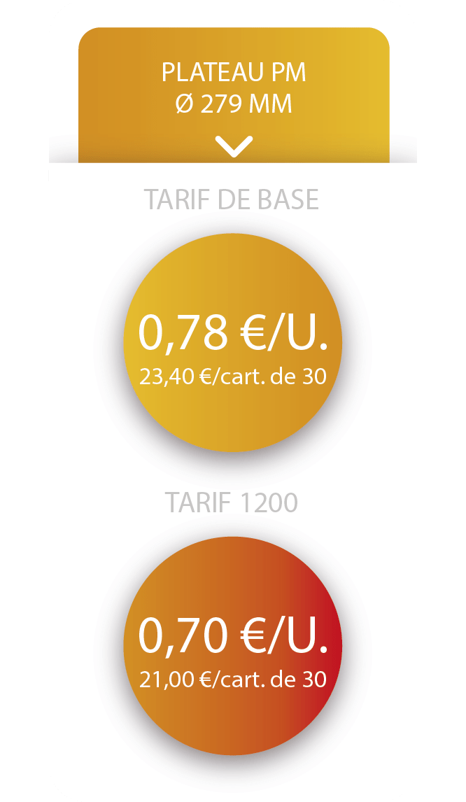 Nous proposons deux grilles tarifaires pour nos plateaux et coiffes. Le TARIF DE BASE, concerne toutes les commandes panachées de moins de 1200 € HT. Le deuxième échelon tarifaire, que nous appelons TARIF 1200, s’applique automatiquement dès que votre panier atteint la somme de 1200 € HT. Pour toute commande groupée donc, des 4 modèles de plateaux, des coiffes et du reste des compléments proposés.